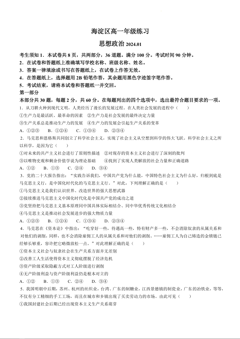 北京市海淀区2023-2024学年高一上学期期末考试政治