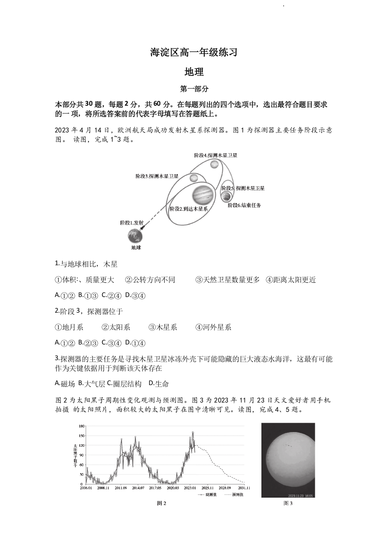 北京市海淀区2023-2024学年高一上学期期末考试地理
