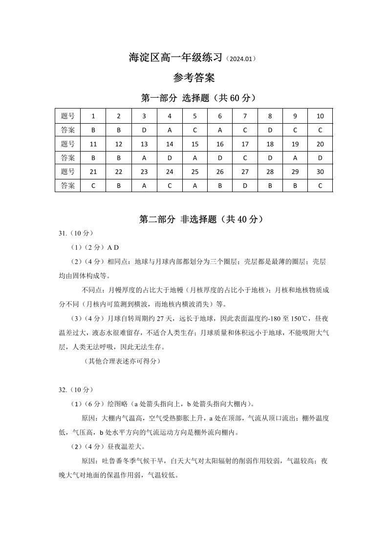 北京市海淀区2023-2024学年高一上学期期末考试地理答案