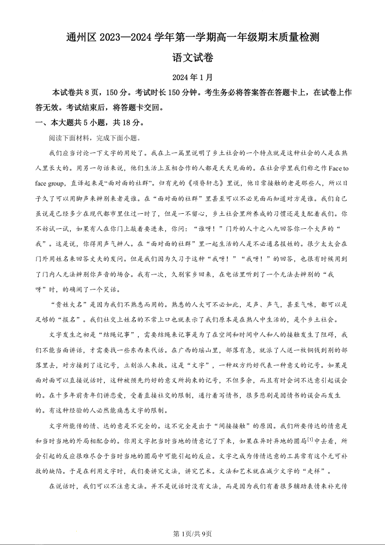 北京市通州区2023-2024学年高一上学期期末考试语文(原卷版)