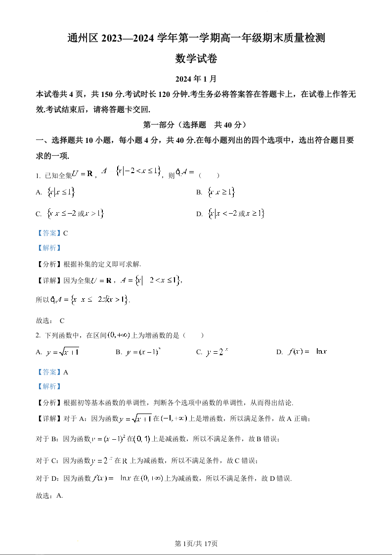 北京市通州区2023-2024学年高一上学期期末考试数学(精品解析版)