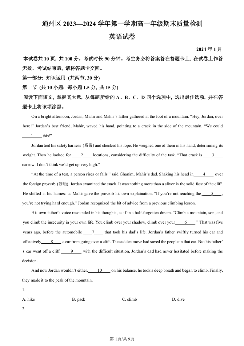 北京市通州区2023-2024学年高一上学期期末考试英语(原卷版)