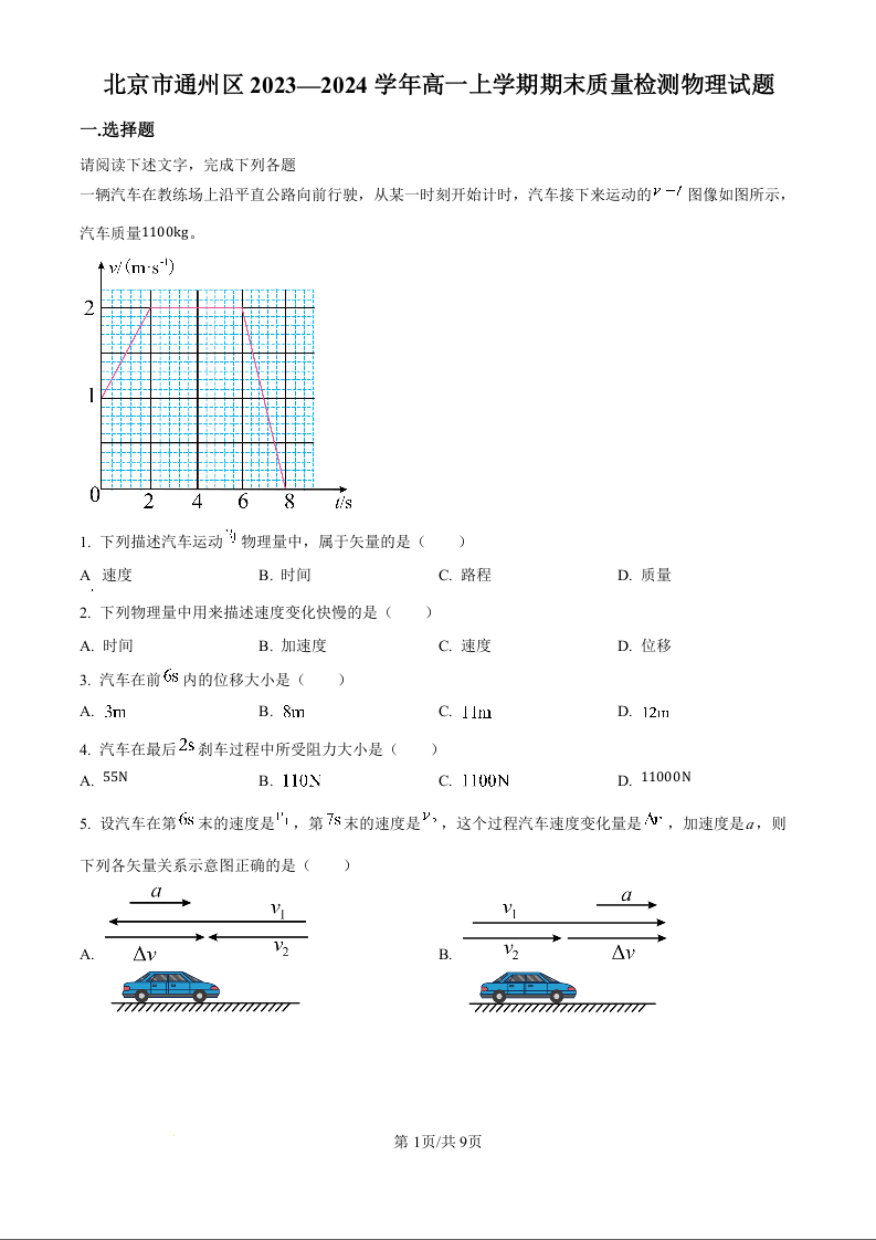 北京市通州区2023-2024学年高一上学期期末考试物理(原卷版)
