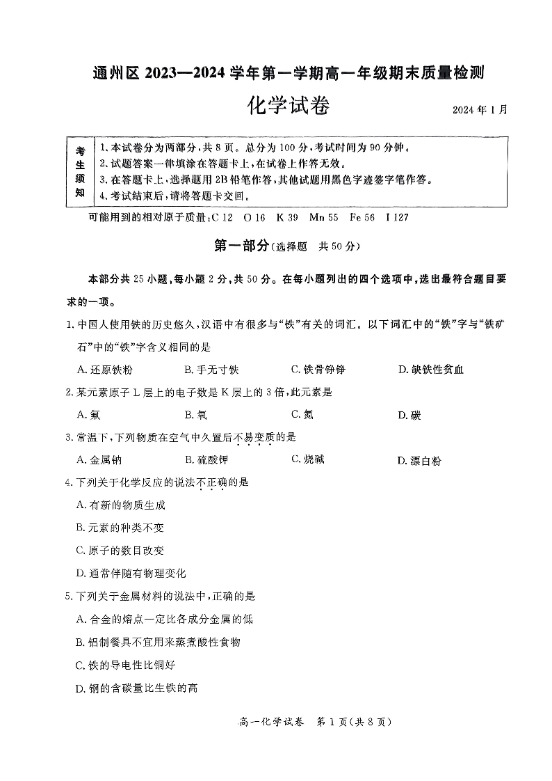 北京市通州区2023-2024学年高一上学期期末考试化学