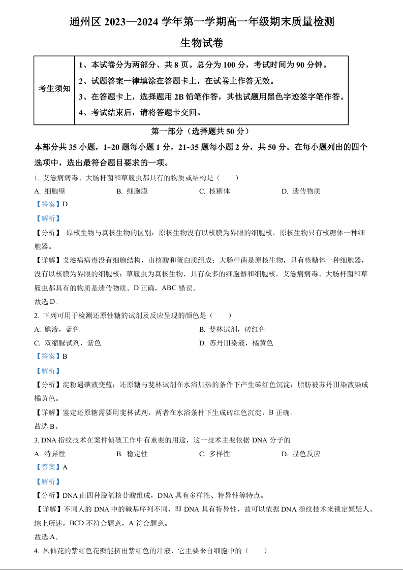 北京市通州区2023-2024学年高一上学期期末考试生物(精品解析版)