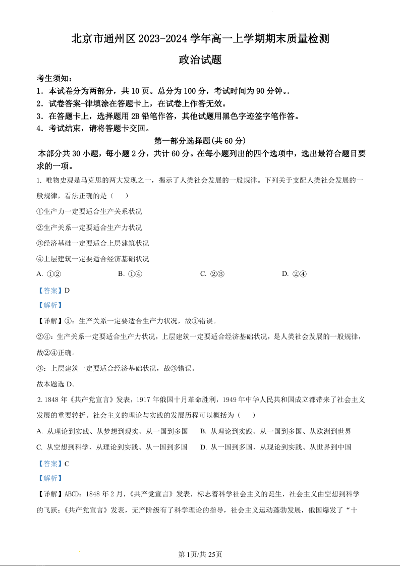北京市通州区2023-2024学年高一上学期期末考试政治(精品解析版)