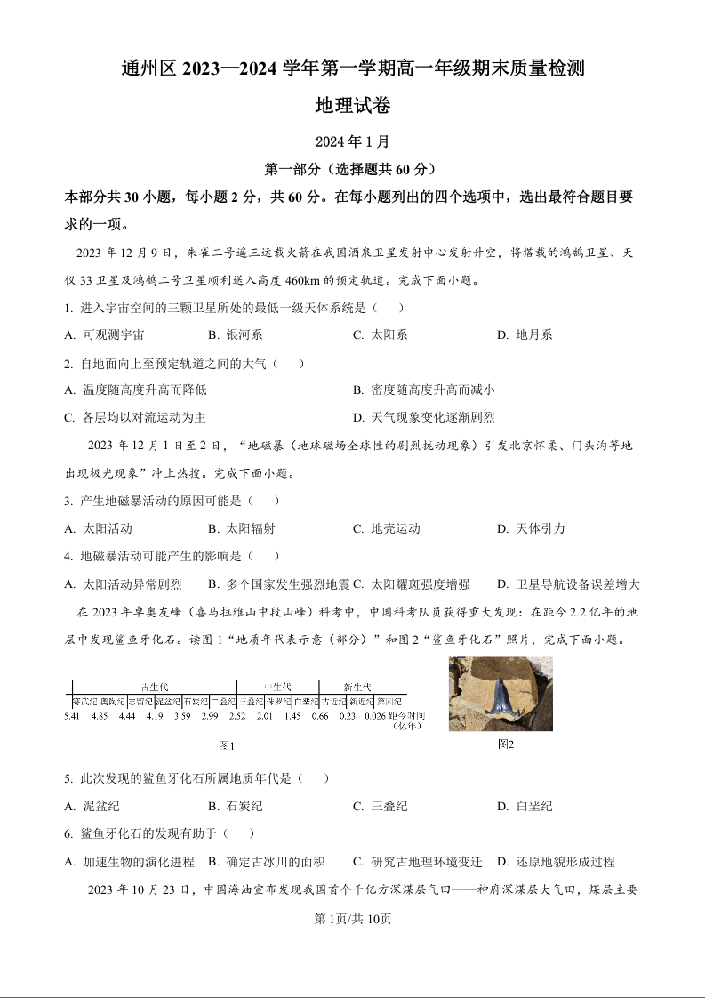 北京市通州区2023-2024学年高一上学期期末考试地理(原卷版)