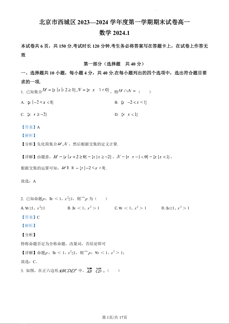 北京市西城区2023-2024学年高一上学期期末考试数学(精品解析版)
