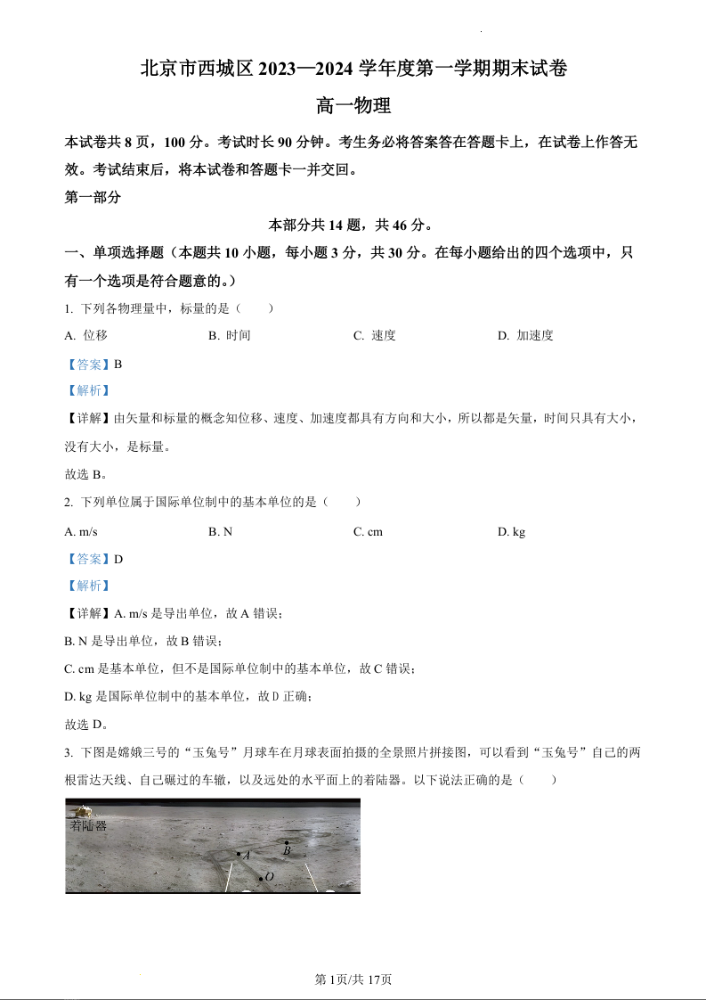 北京市西城区2023-2024学年高一上学期期末考试物理(精品解析版)
