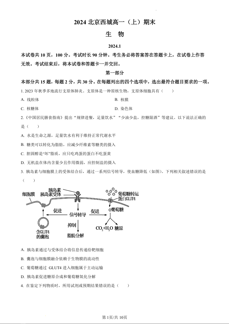 北京市西城区2023-2024学年高一上学期期末考试生物(原卷版)