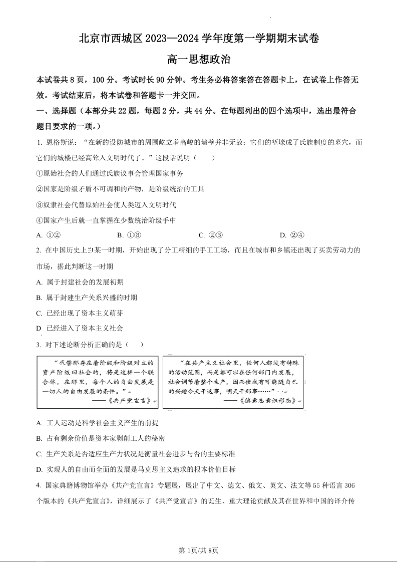 北京市西城区2023-2024学年高一上学期期末考试政治(原卷版)