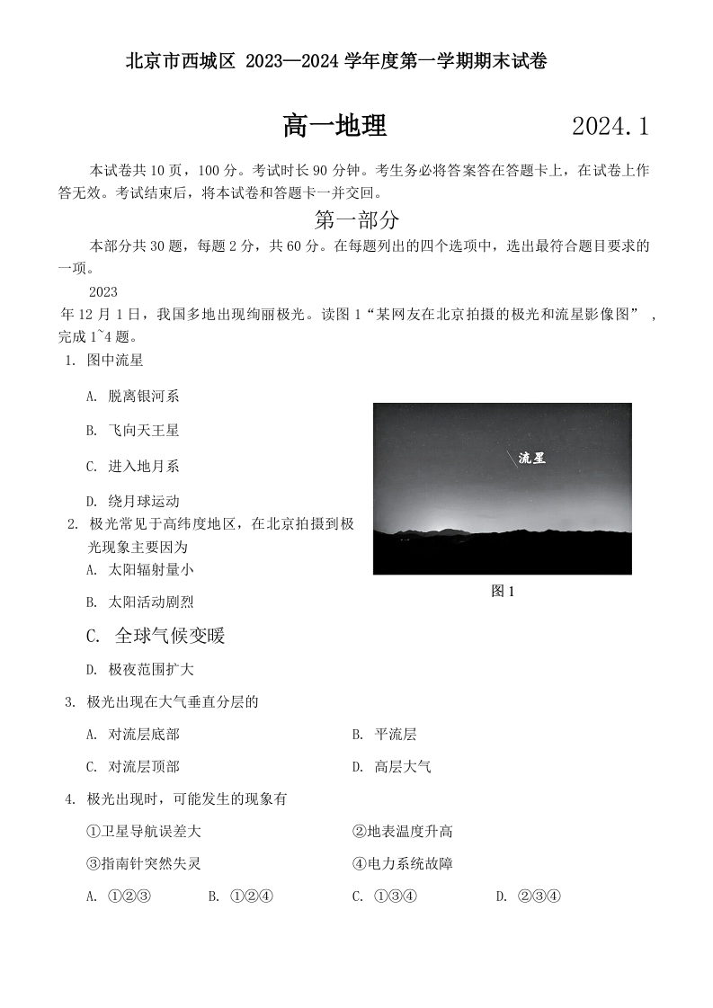 北京市西城区2023-2024学年高一上学期期末考试地理