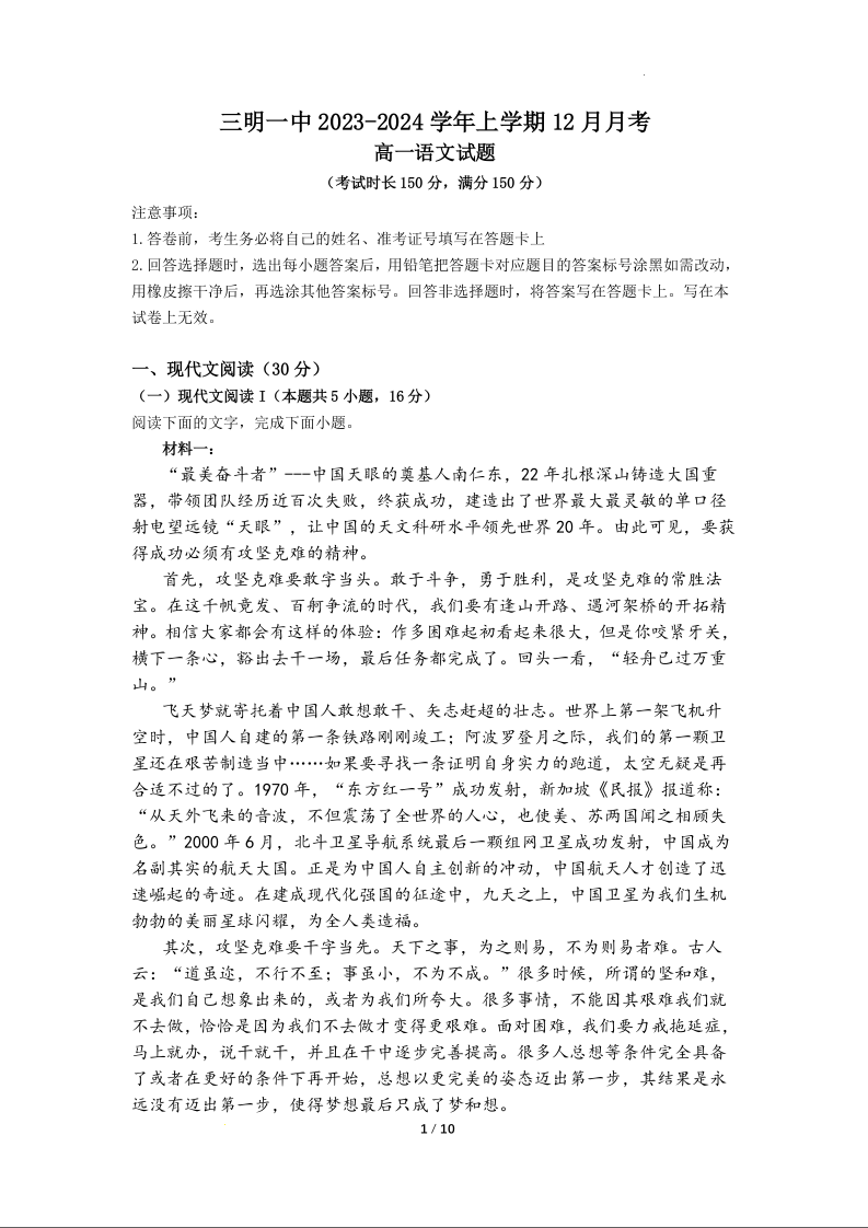 福建省三明第一中学2023-2024学年高一上学期12月月考语文