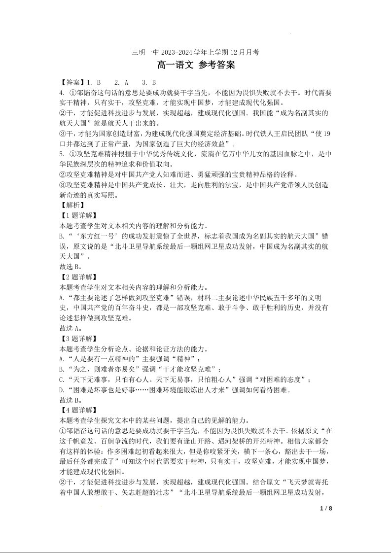 福建省三明第一中学2023-2024学年高一上学期12月月考语文答案