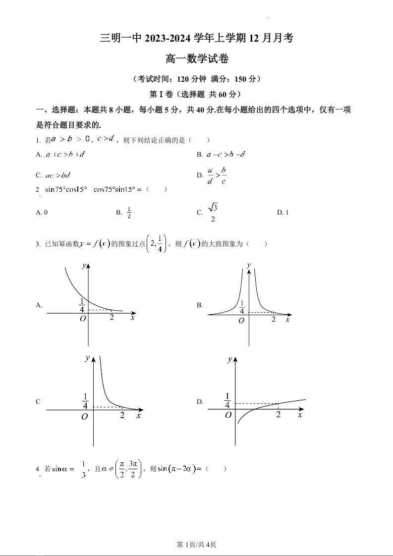福建省三明第一中学2023-2024学年高一上学期12月月考数学(原卷版)