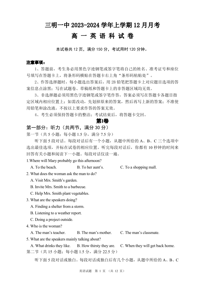 福建省三明第一中学2023-2024学年高一上学期12月月考英语