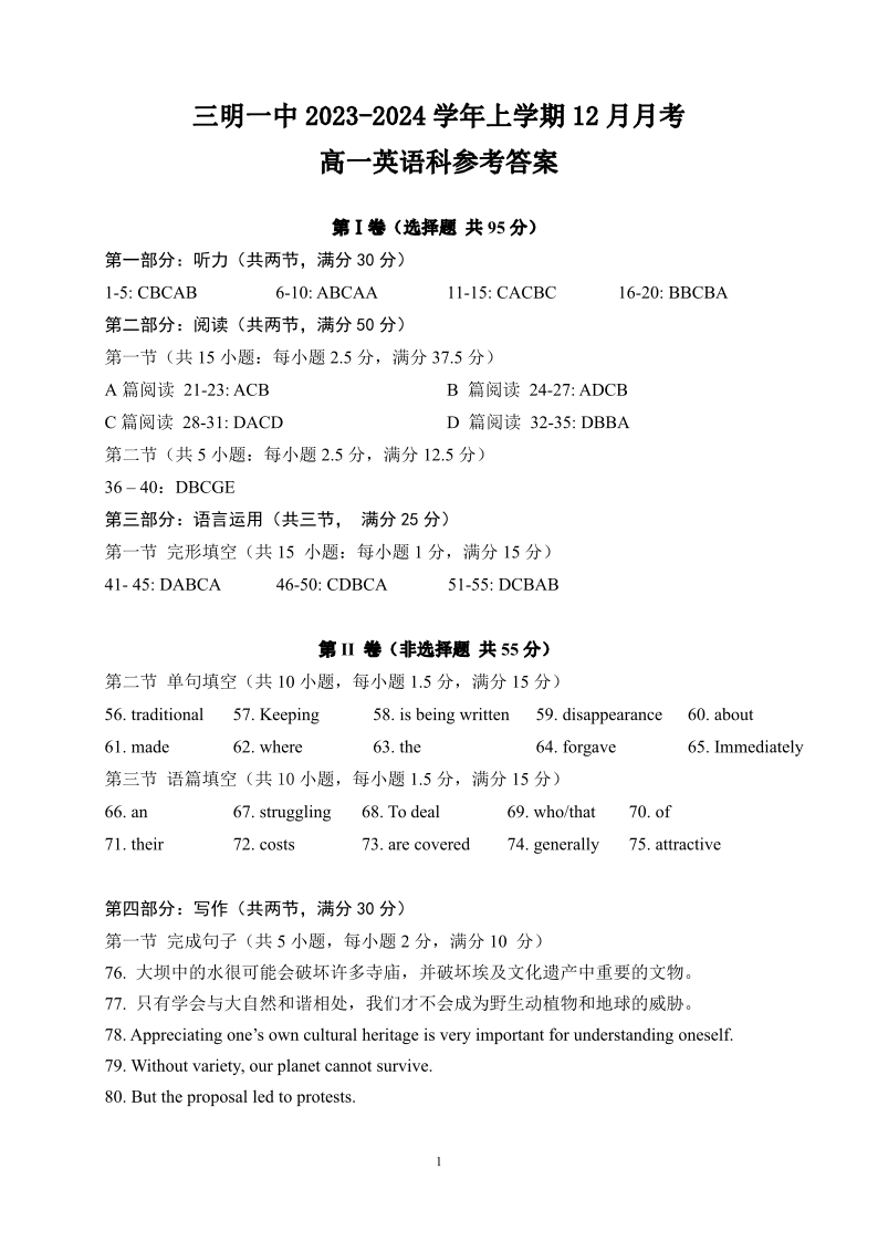 福建省三明第一中学2023-2024学年高一上学期12月月考英语答案