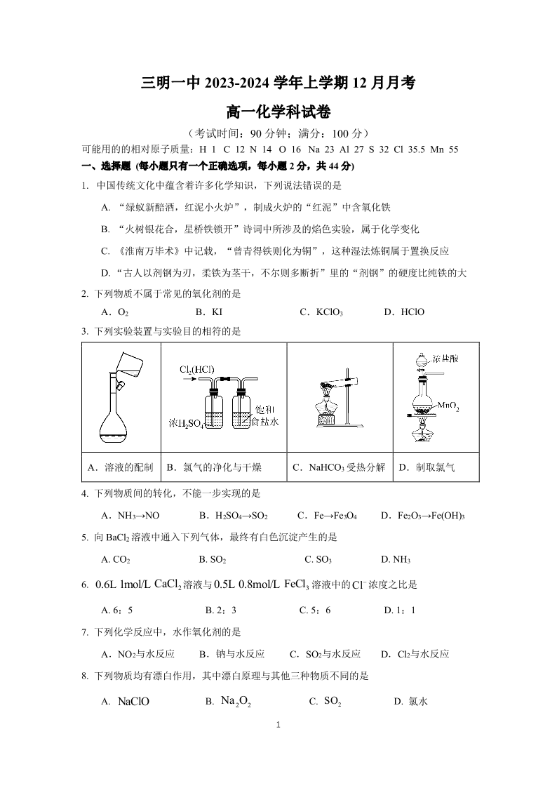 福建省三明第一中学2023-2024学年高一上学期12月月考化学