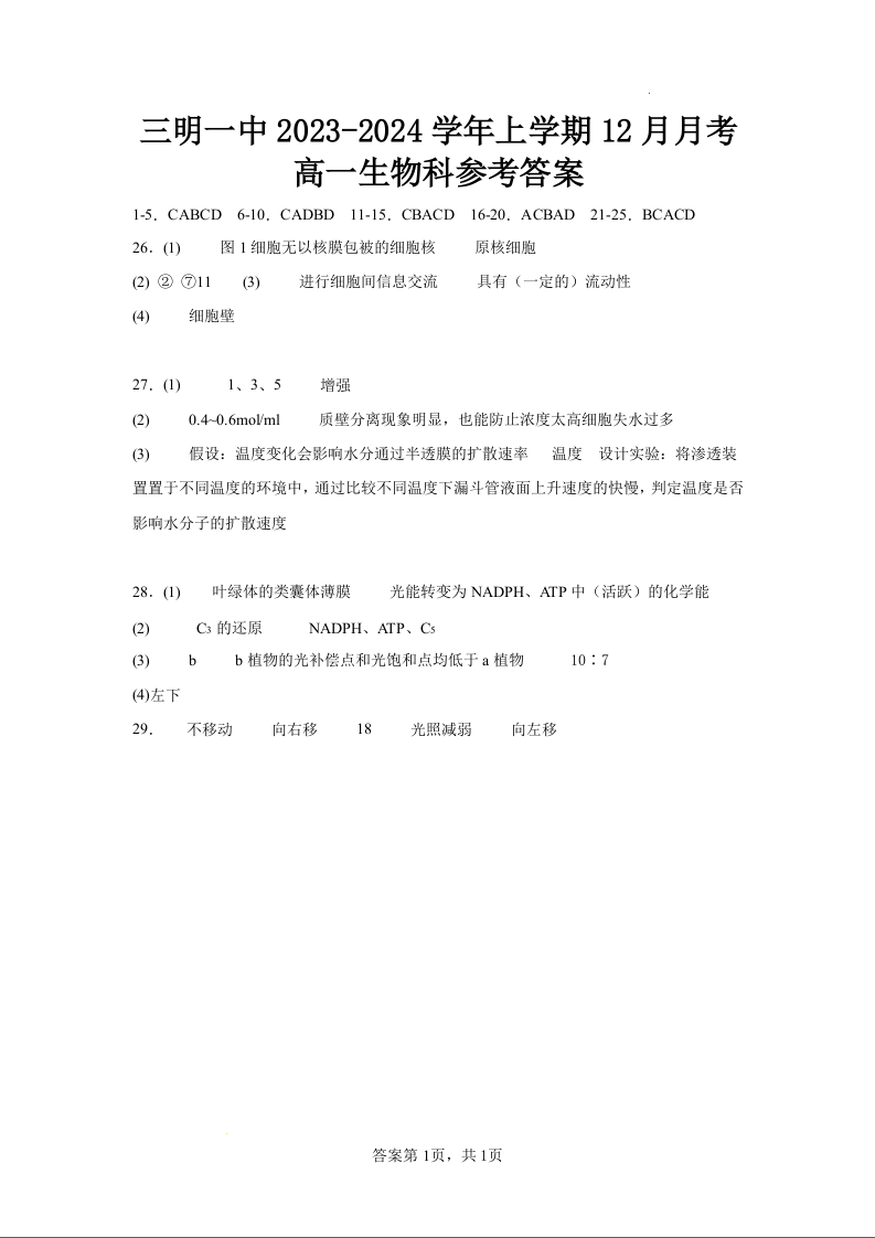 福建省三明第一中学2023-2024学年高一上学期12月月考生物答案