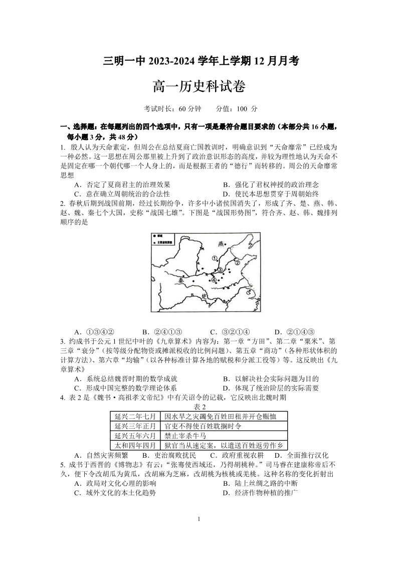 福建省三明第一中学2023-2024学年高一上学期12月月考历史