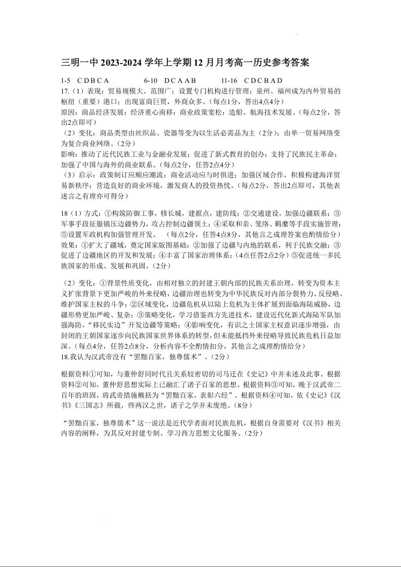 福建省三明第一中学2023-2024学年高一上学期12月月考历史答案