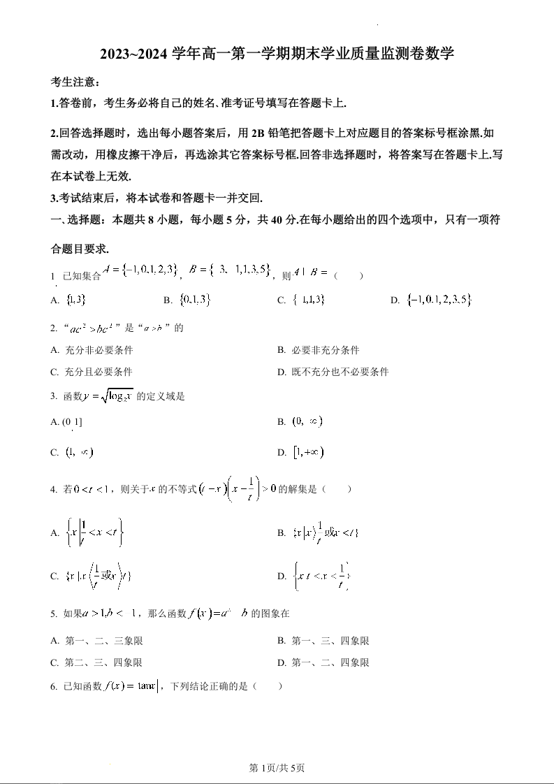 甘肃省2023-2024学年高一上学期期末考试数学(原卷版)