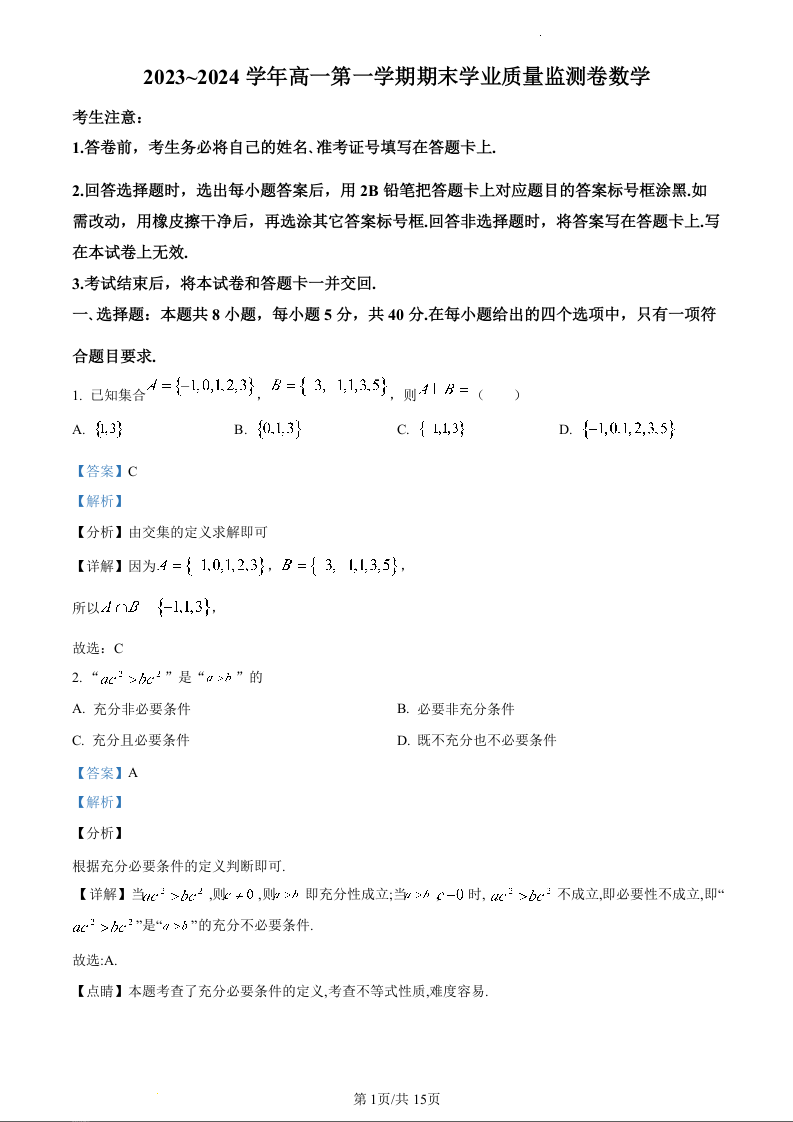 甘肃省2023-2024学年高一上学期期末考试数学(精品解析版)