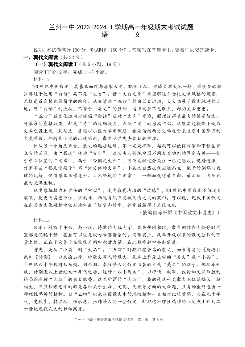 甘肃省兰州市城关区第一中学2023-2024学年高一上学期1月期末考试语文