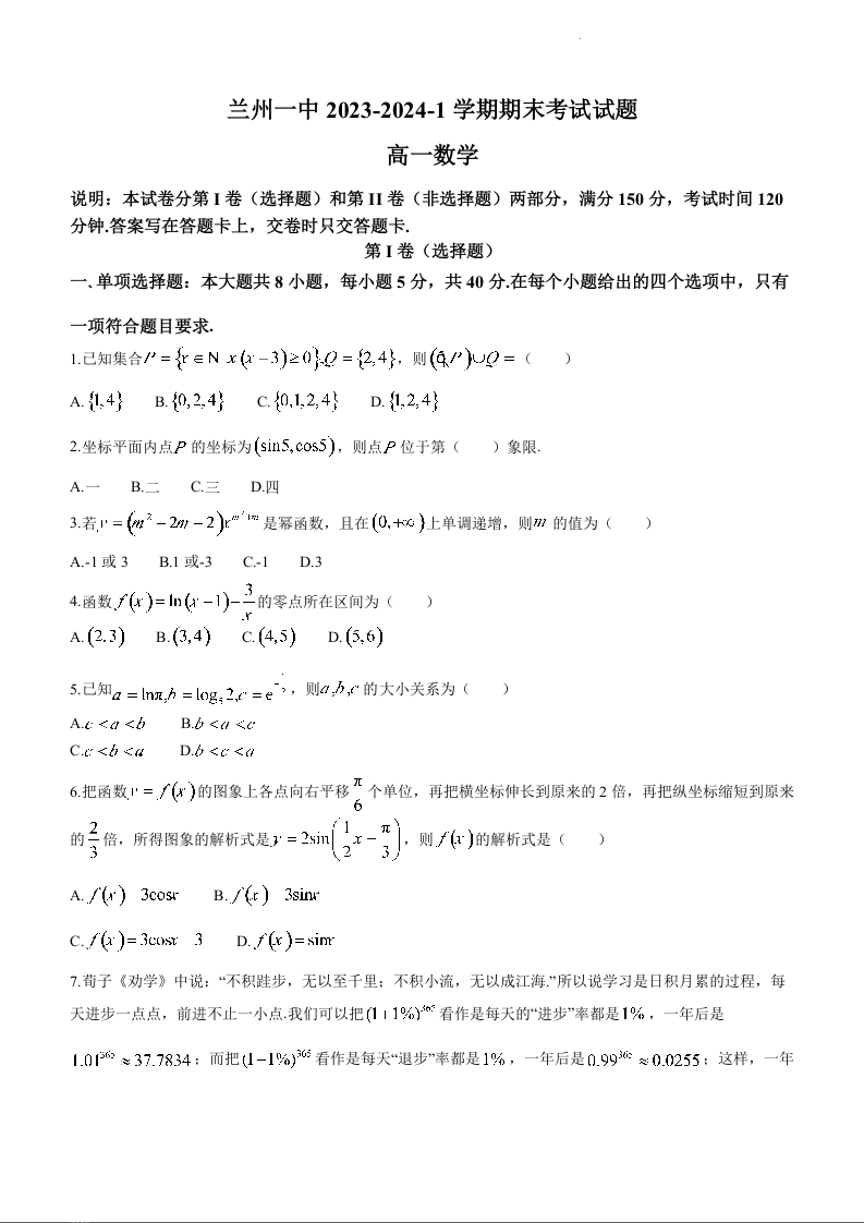 甘肃省兰州市城关区第一中学2023-2024学年高一上学期1月期末考试数学+答案
