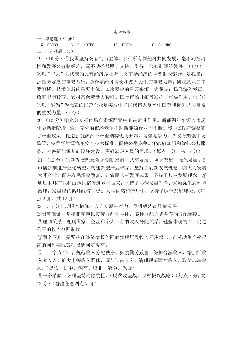 甘肃省兰州市城关区第一中学2023-2024学年高一上学期1月期末考试政治答案