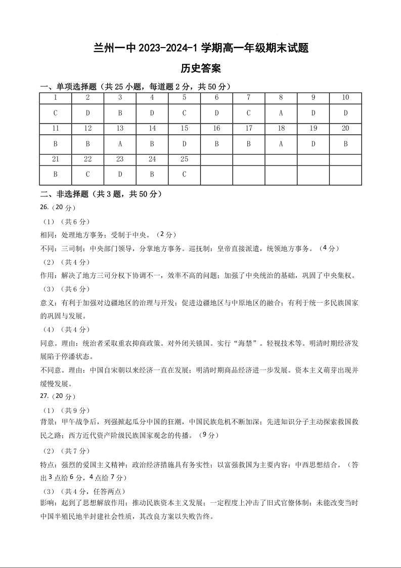 甘肃省兰州市城关区第一中学2023-2024学年高一上学期1月期末考试历史答案