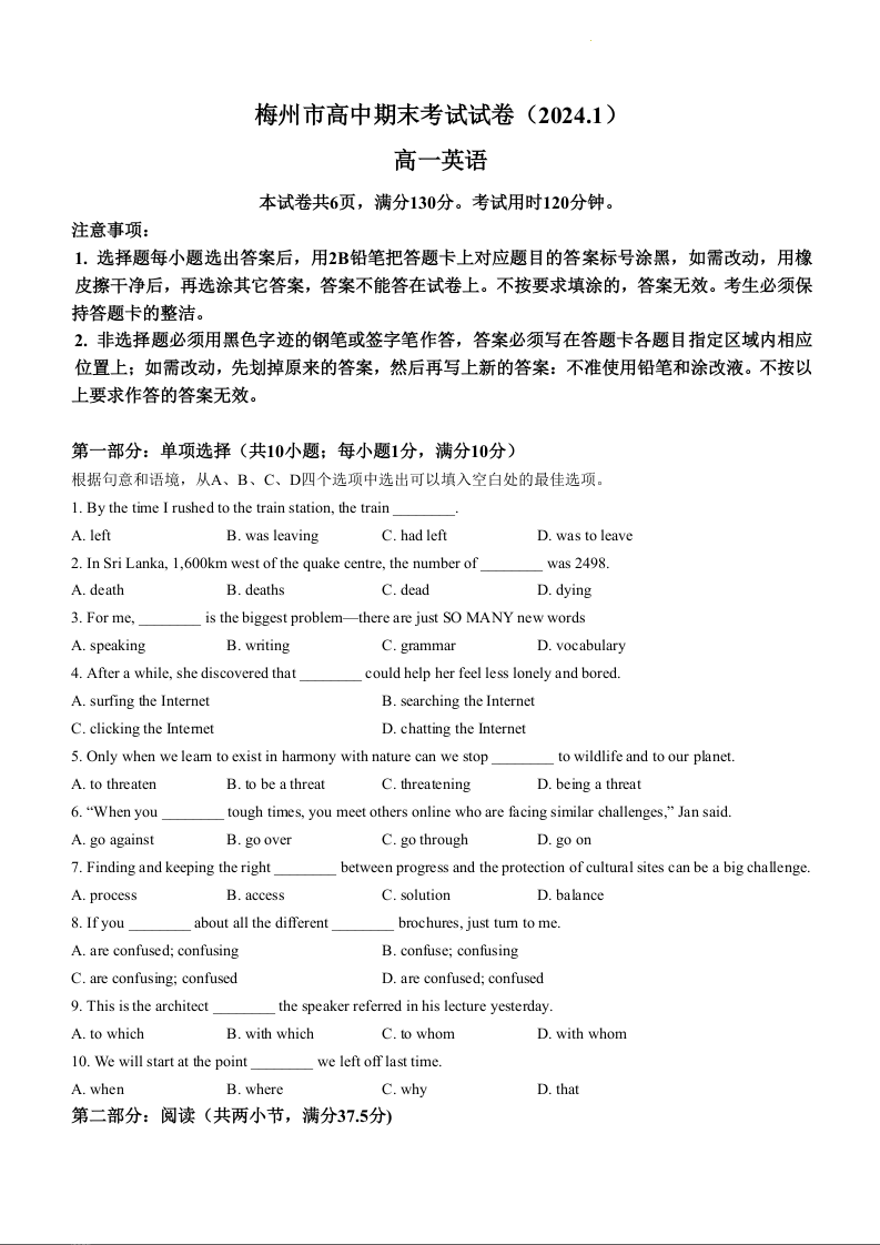 广东省梅州市2023-2024学年高一上学期期末联考英语+答案