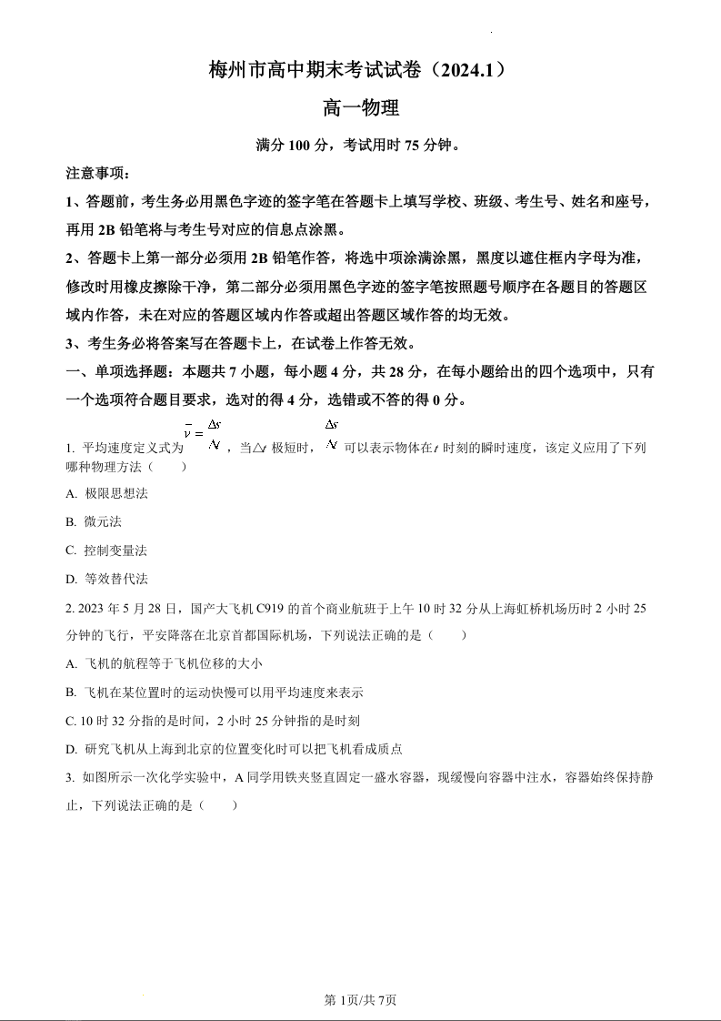 广东省梅州市2023-2024学年高一上学期期末考试物理(原卷版)