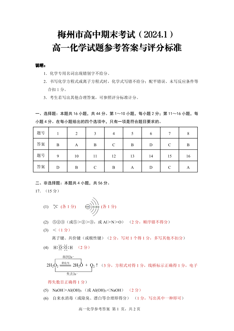 广东省梅州市2023-2024学年高一上学期期末考试化学答案