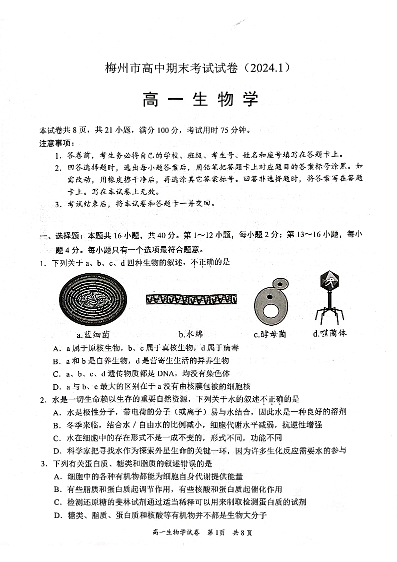 广东省梅州市2023-2024学年高一上学期期末考试生物