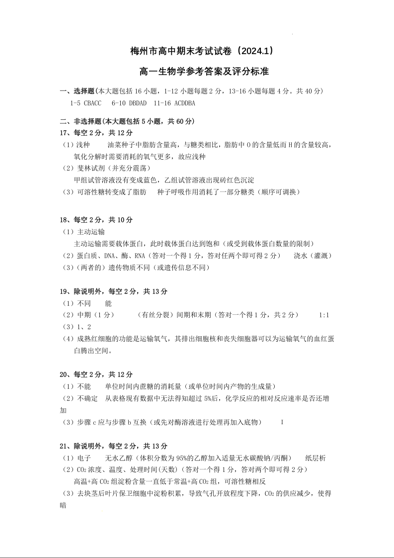 广东省梅州市2023-2024学年高一上学期期末考试生物答案