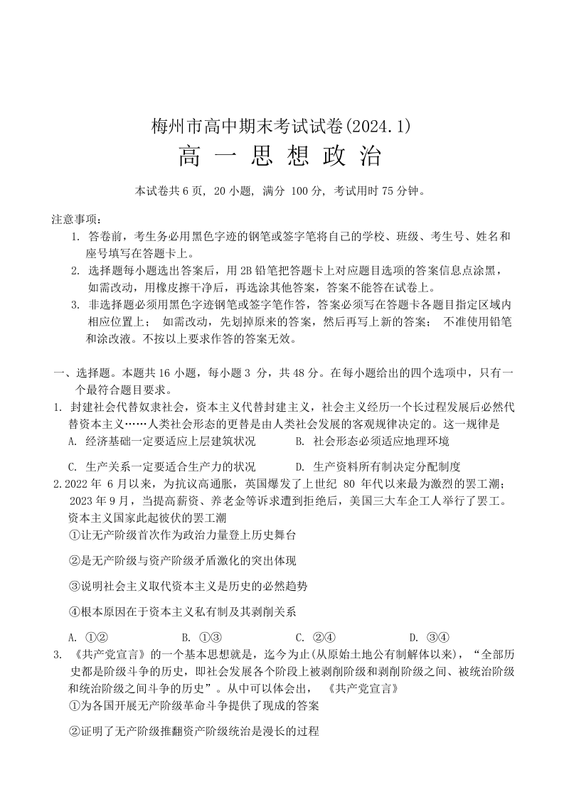 广东省梅州市2023-2024学年高一上学期期末考试政治
