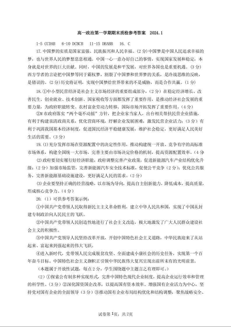 广东省梅州市2023-2024学年高一上学期期末考试政治答案