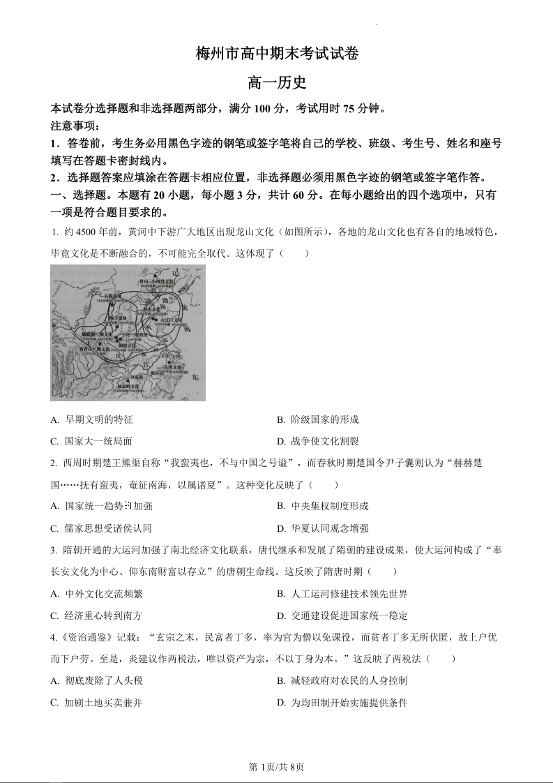 广东省梅州市2023-2024学年高一上学期期末考试历史(原卷版)