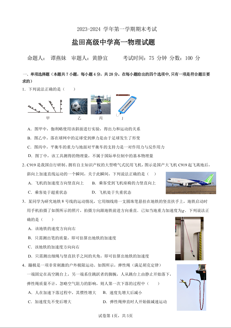 广东省深圳市盐田高级中学2023-2024学年高一上学期1月期末考试物理