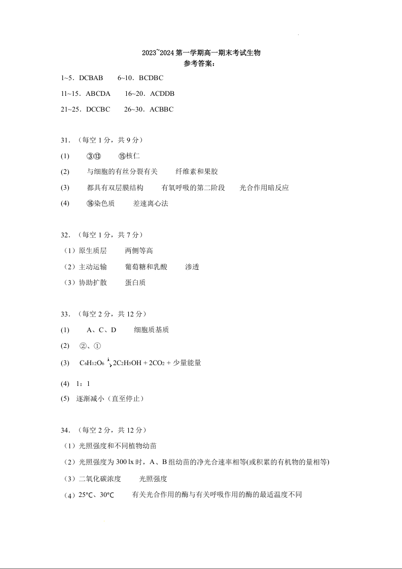 广东省深圳市盐田高级中学2023-2024学年高一上学期1月期末考试生物答案