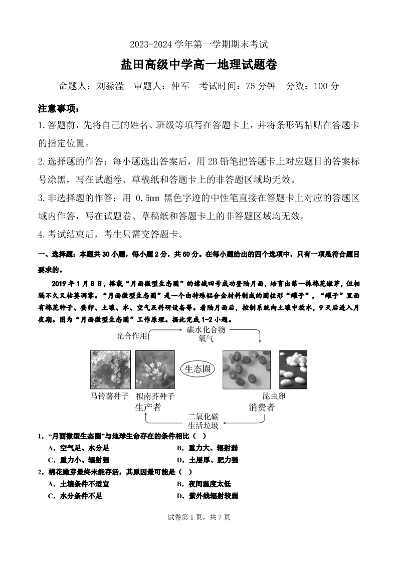 广东省深圳市盐田高级中学2023-2024学年高一上学期1月期末考试地理