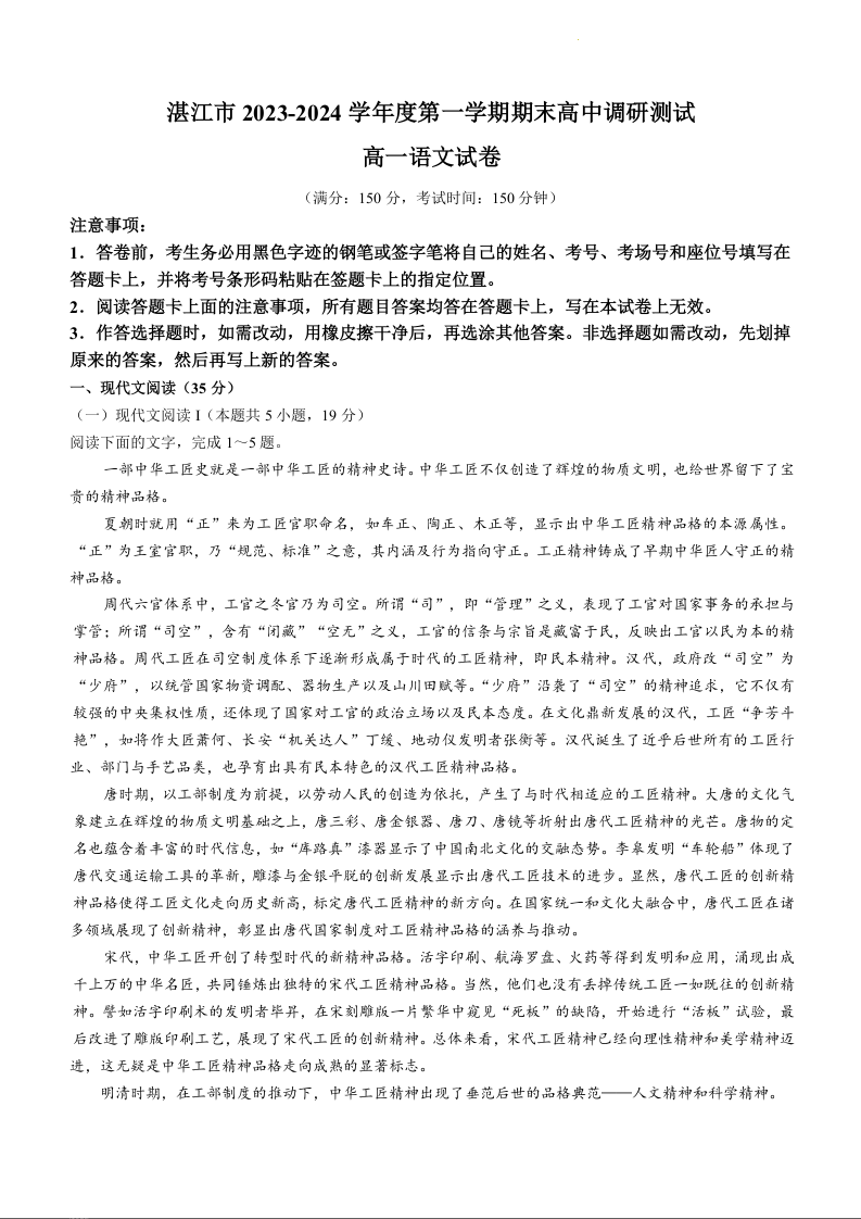 广东省湛江市2023-2024学年高一上学期期末考试语文