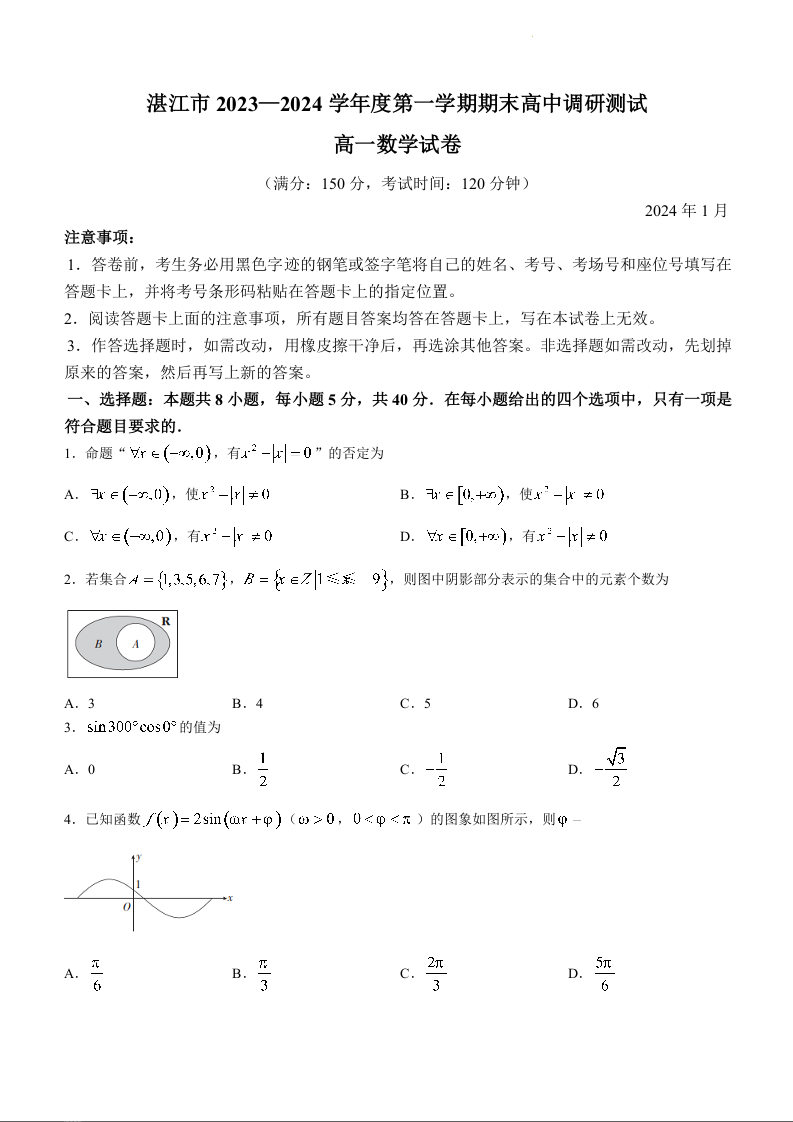 广东省湛江市2023-2024学年高一上学期期末考试数学