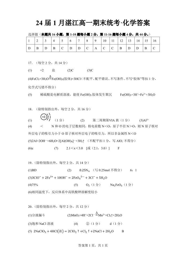广东省湛江市2023-2024学年高一上学期期末考试化学答案