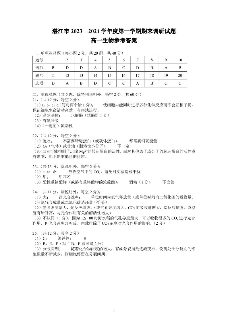 广东省湛江市2023-2024学年高一上学期期末考试生物答案