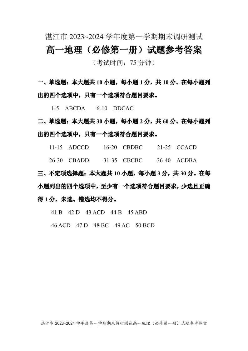 广东省湛江市2023-2024学年高一上学期期末考试地理答案