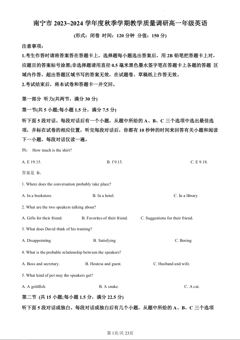 广西壮族自治区南宁市2023-2024学年高一上学期1月期末考试英语(精品解析版)