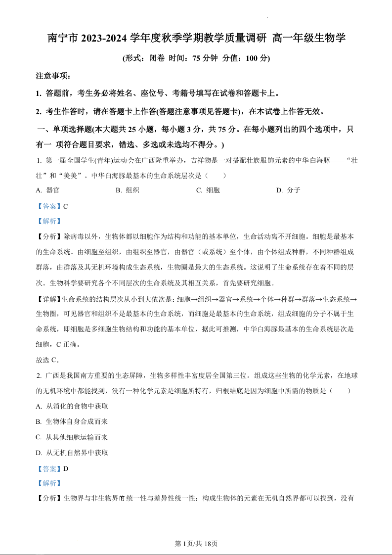 广西壮族自治区南宁市2023-2024学年高一上学期1月期末考试生物(精品解析版)