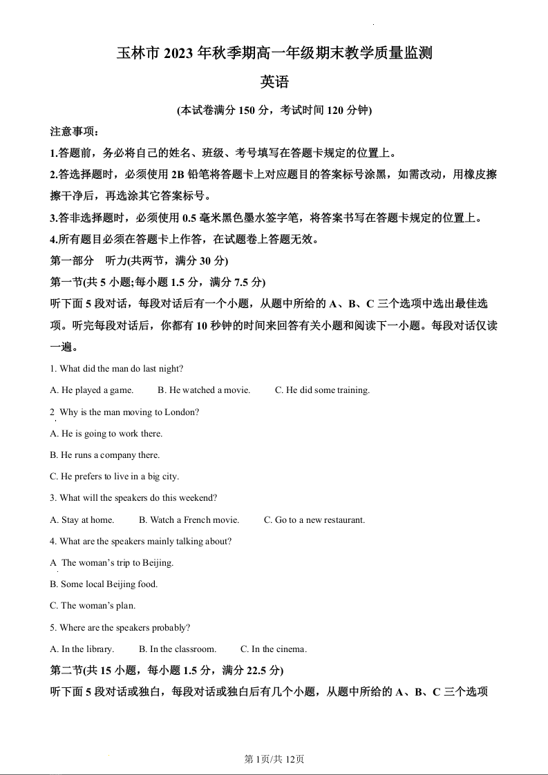广西壮族自治区玉林市2023-2024学年高一上学期期末考试英语(原卷版)